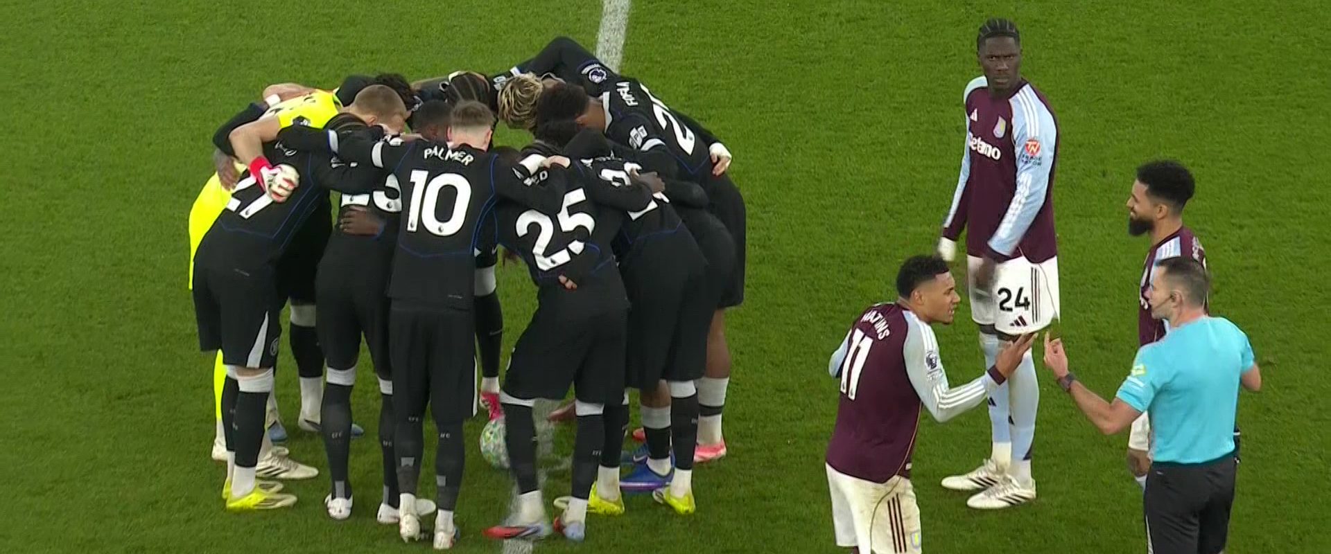 În timp ce Aston Villa se pregătea de reluarea jocului, jucătorii lui Chelsea s-au adunat în jurul mingii, în centrul terenului. Această tactică, care a surprins pe toată lumea, a dus la nemulțumirea vizibilă a jucătorilor de la Villa, inclusiv a lui Ollie Watkins și Douglas Luiz, care au protestat vehement la adresa arbitrului Jarred Gillett. În ciuda protestelor, Chelsea a continuat cu strategia neobișnuită.